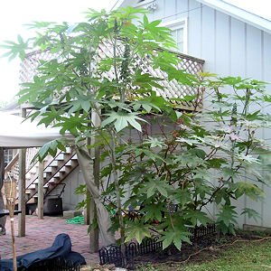 The castor bean plant, an erect, tropical shrub or small tree, grows up to 30 feet tall. As an annual in the cooler zones, it grows up to 15' tall. Do you want a private hedge in less than 2 months? Then the castor bean is the right plant for you. The tropical look gives your yard an exotic flair.
